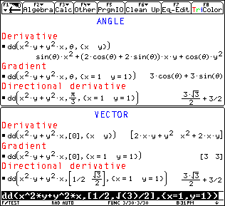 The gradient: If AngleOrVector is a zero vector, [0], or evaluates to a variable, and VarPointList includes the point. If AngleOrVector is a vector, the gradient will be returned as a vector. The directional derivative: If AngleOrVector is an angle or a non-zero vector. Examples: